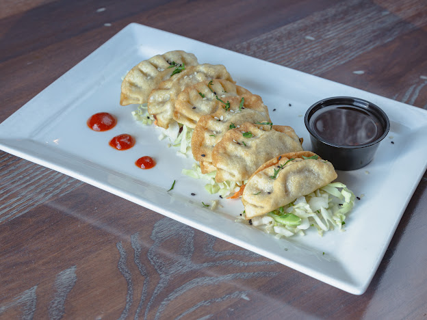 Pork and vegetable potstickers, served with soy-chili dipping sauce, Sriracha