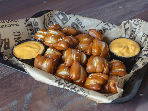 Pretzel knots, salt, warm cheese sauce, grain mustard