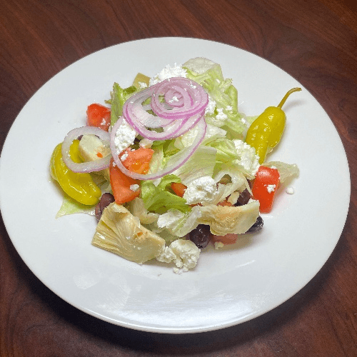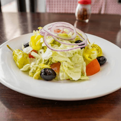Lettuce, tomato, onions, olives, pepperoncini, Banana peppers. With our signature house-made dressings