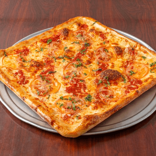 16" square thin crust pizza, fresh tomatoes, fresh mozzarella cheese, basil