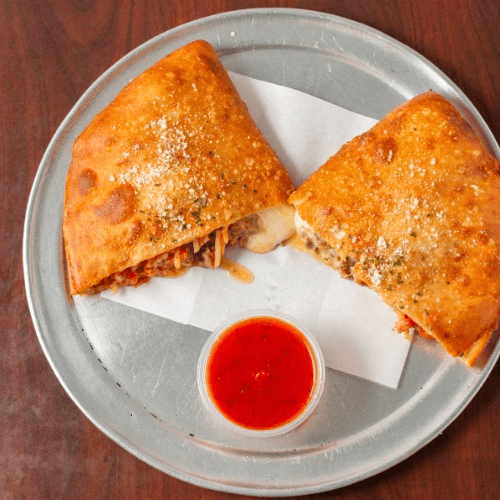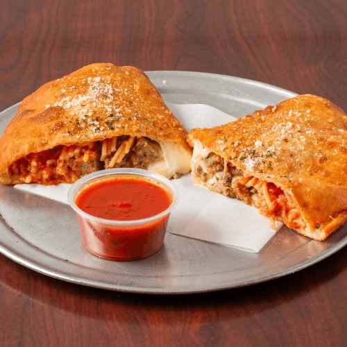 Spaghetti, marinara, mozzarella & choice of meatball or sausage baked inside pizza dough