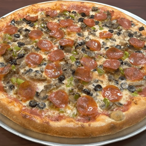 Pepperoni, sausage, mushroom, black olive, onion, green pepper, garlic