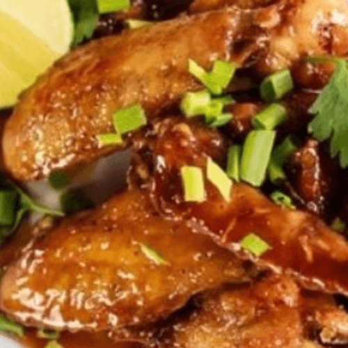 Cooked wing of a chicken coated in sauce or seasoning