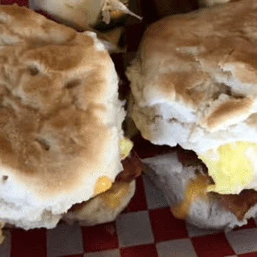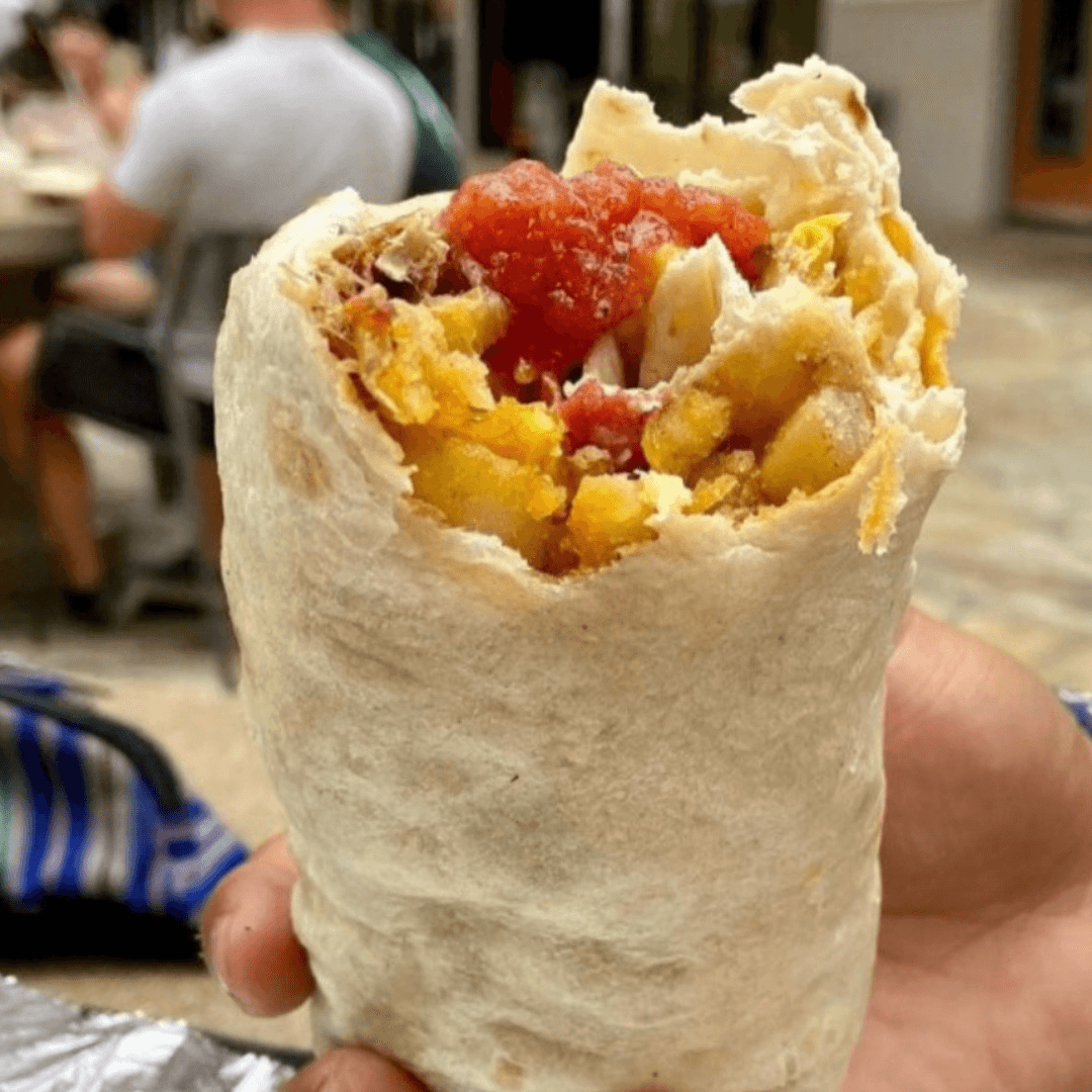 Biscuit, bacon, eggs wrapped up in a warm tortilla with our white sausage gravy