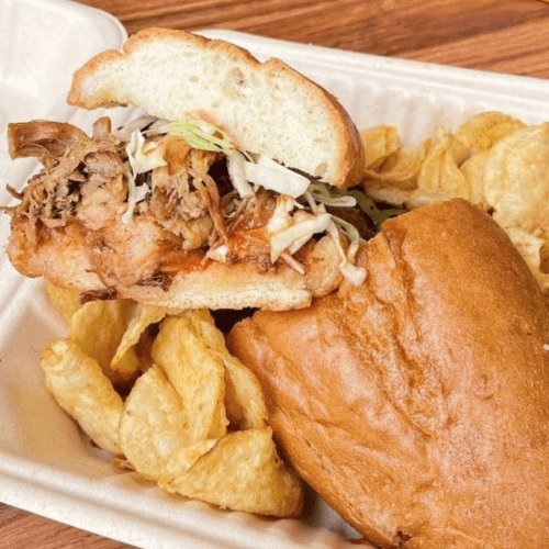 Choice: 12-hour slow-roasted kalua pulled pork or pulled chicken guava BBQ sauce, grilled onions, and slaw