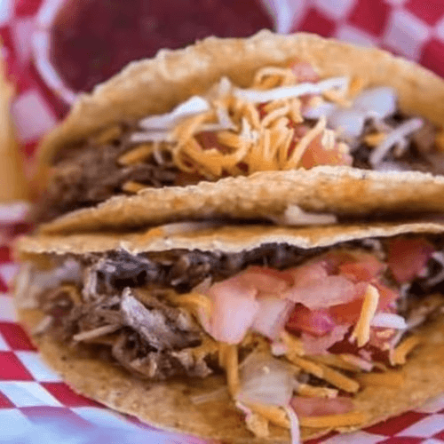 3 soft shell corn tacos with thinly cut cabbage with papaya seed dressing, juicy kalua pork, shredded cheese, guava BBQ sauce, and topped with cilantro, onions, and tomatoes