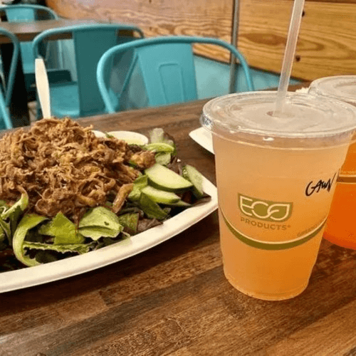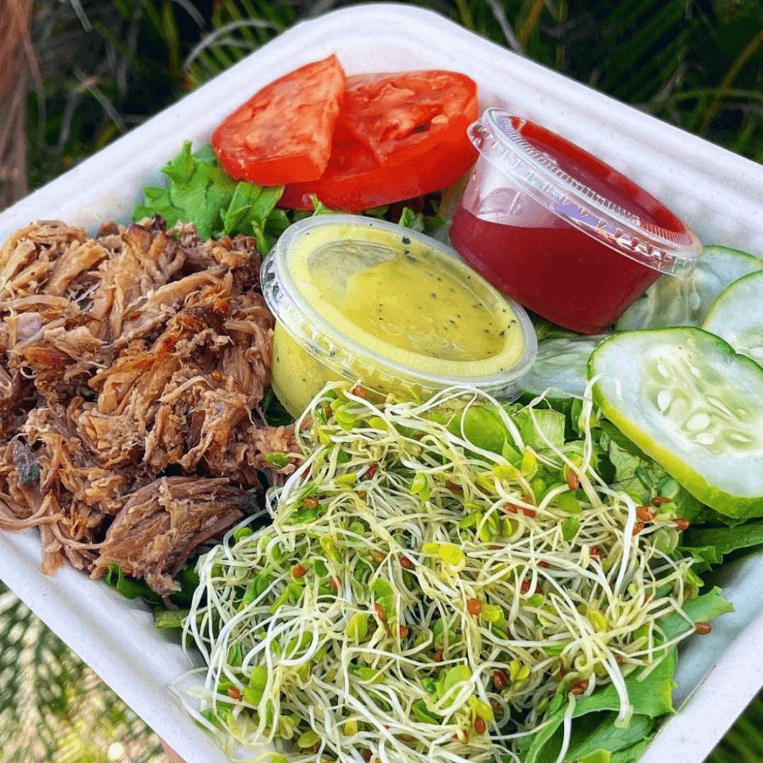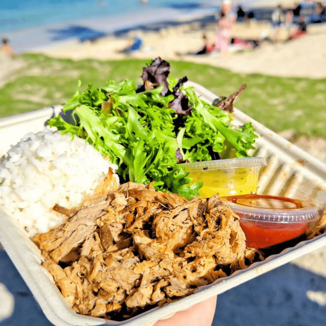 12-hour slow-roasted kalua pulled pork, white rice, mesdun salad, homemade guava BBQ sauce, and homemade papaya seed dressing