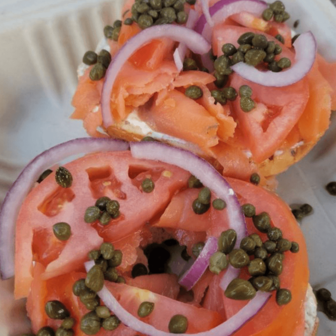 Cream cheese, smoked salmon, red onions, tomato, & capers