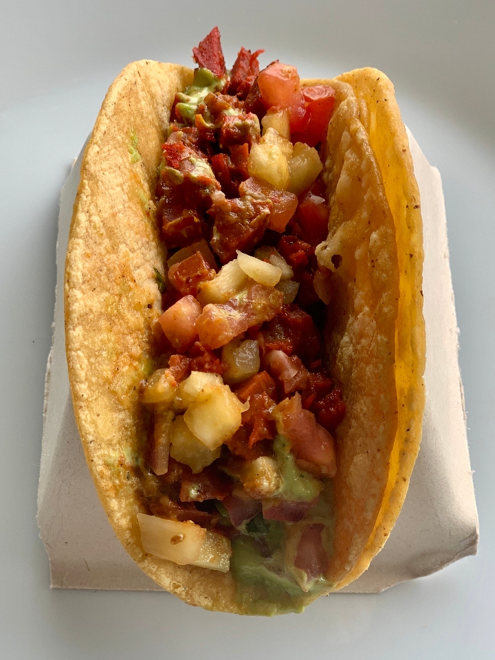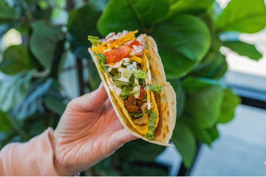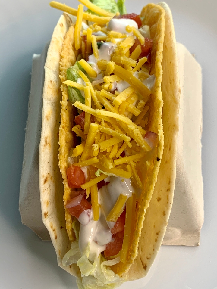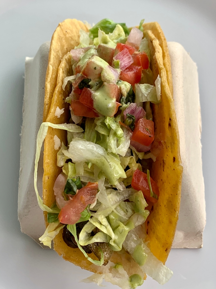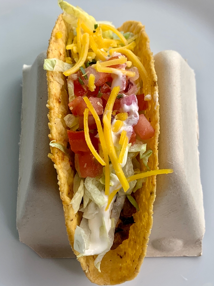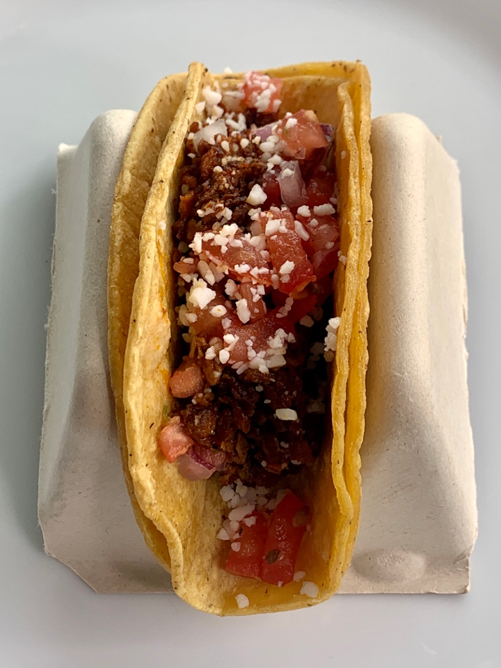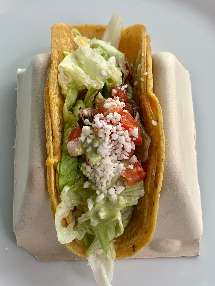 Crunchy corn shell , seasoned Beyond beef, lettuce, cheddar, crema and pico