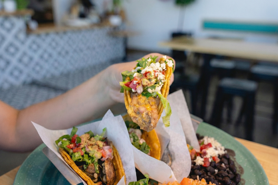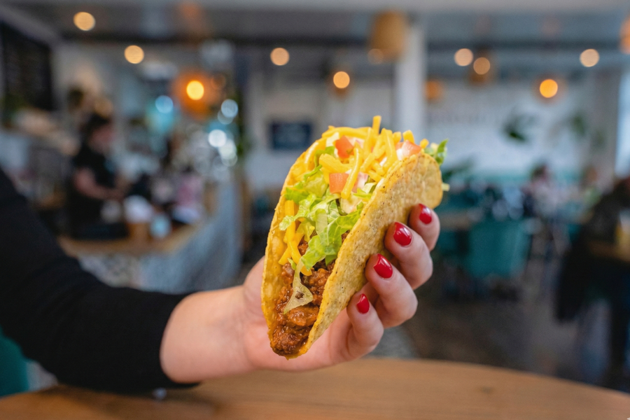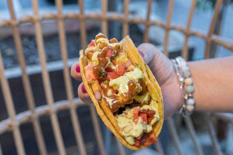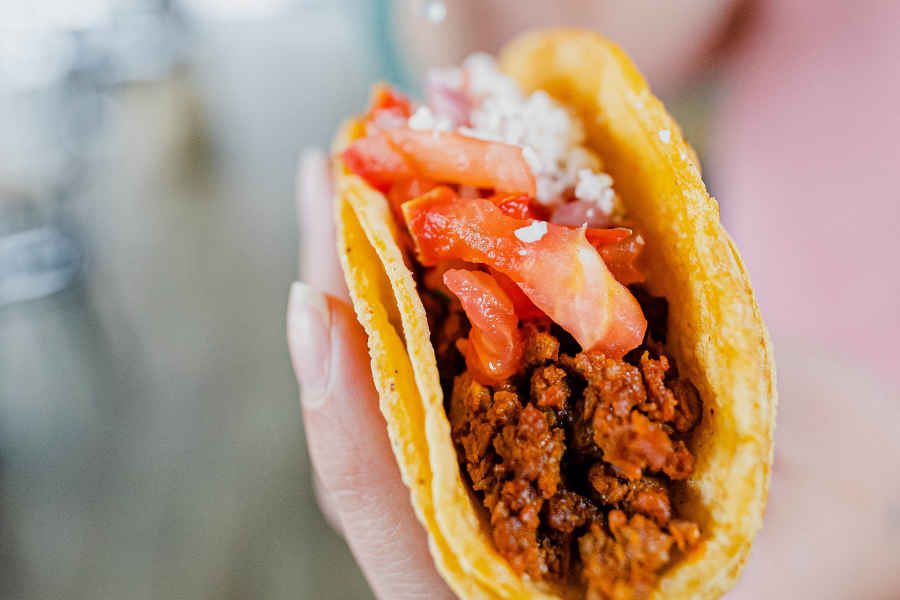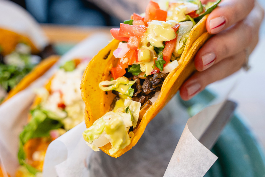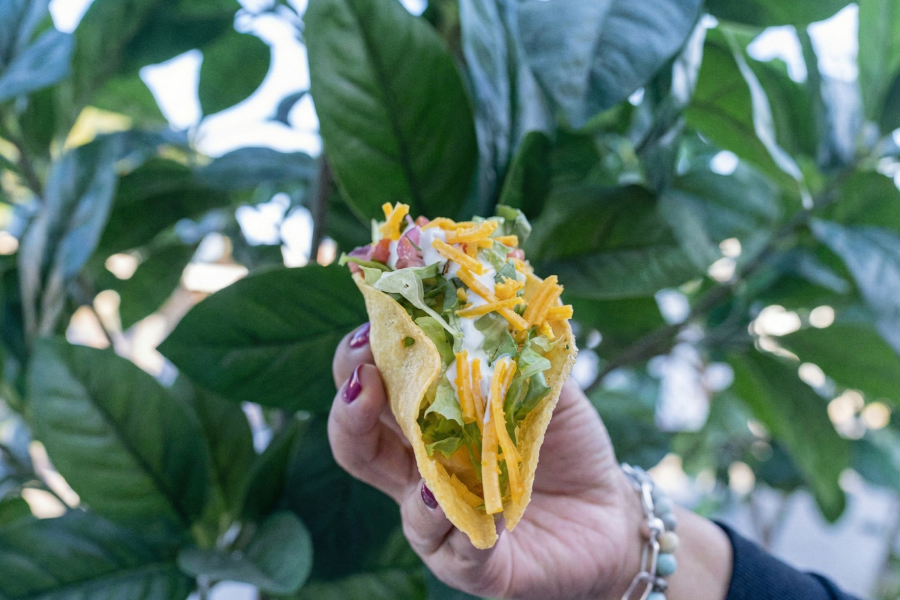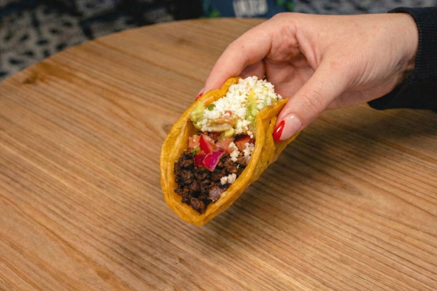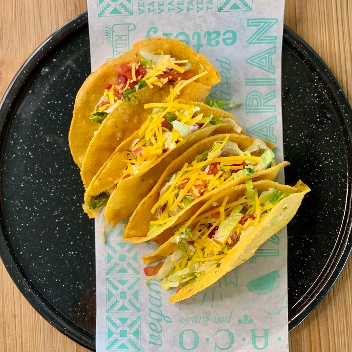 Crunchy corn shell , seasoned Beyond beef, lettuce, cheddar, crema and pico