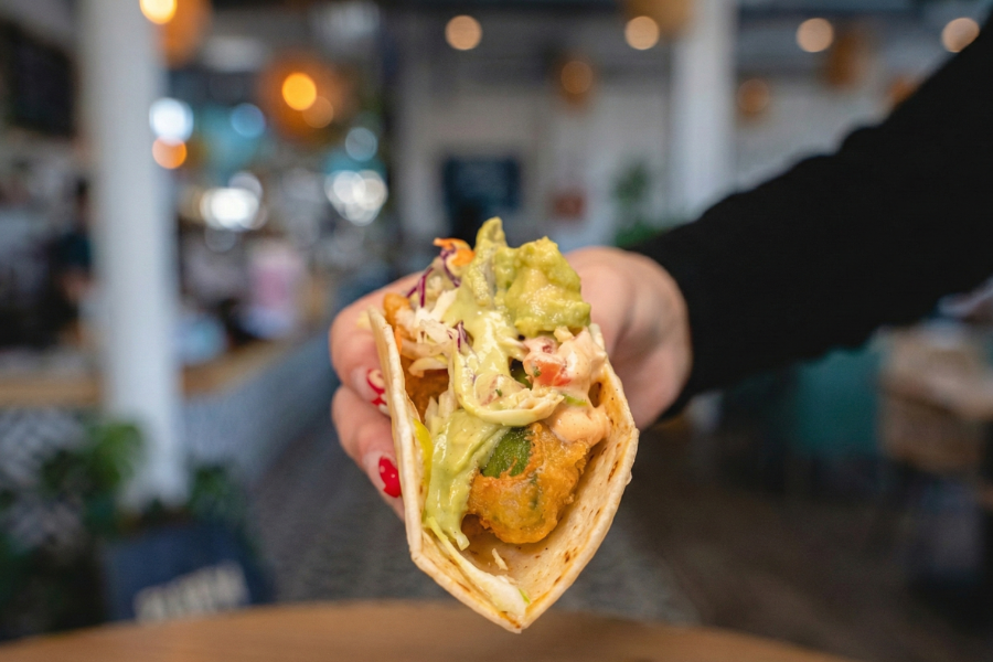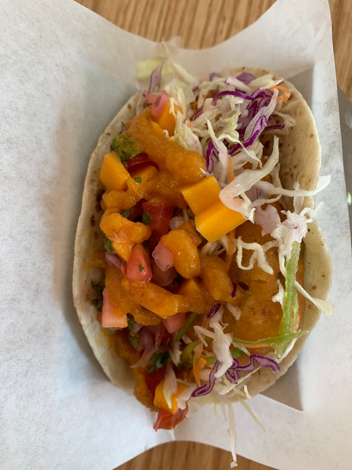 Gardein fishless fish filet, mango pico de gallo, slaw, mango chipotle salsa; served on a flour tortilla