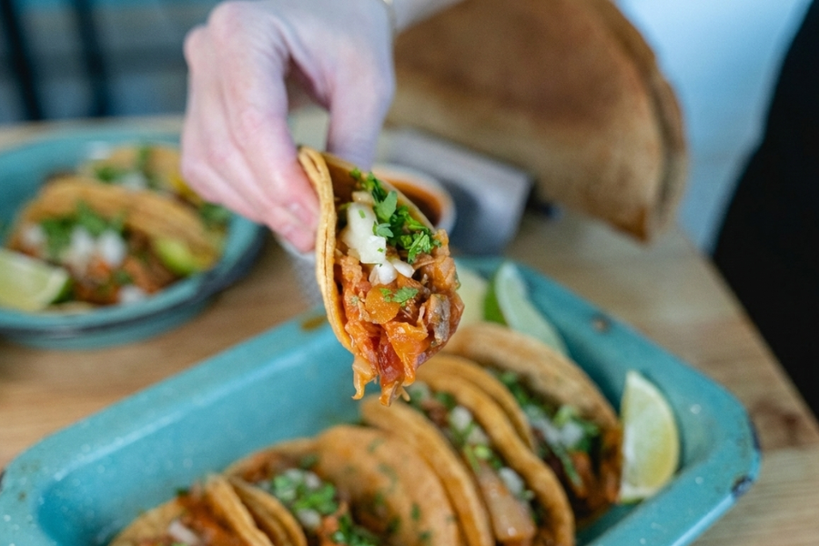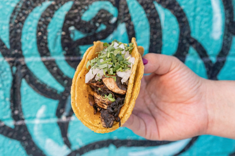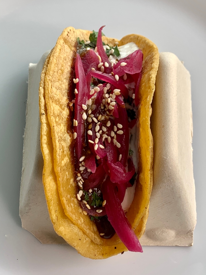 Corn tortilla, chili-braised jackfruit, onion, & cilantro