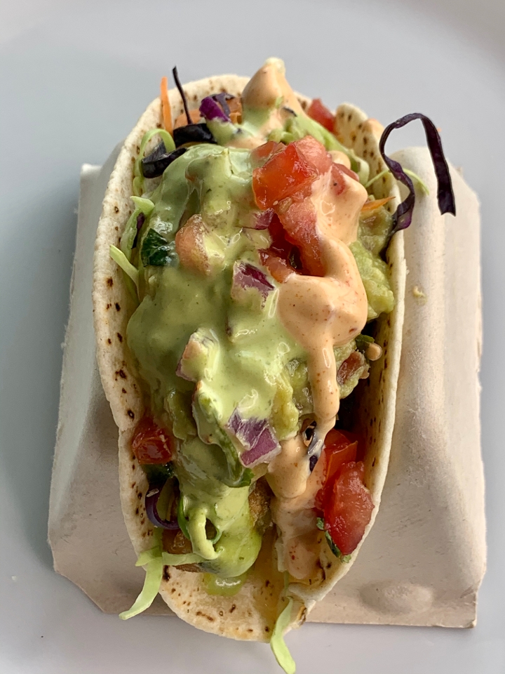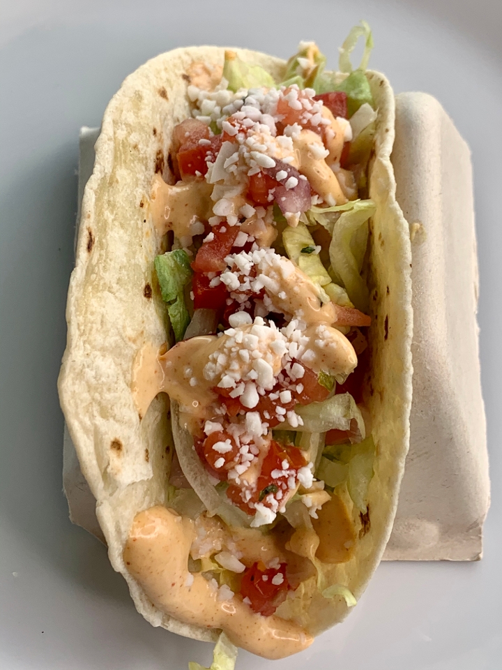 Flour tortilla, breaded crispy Gardein , lettuce, chili-lime mayo, pico, queso fresco