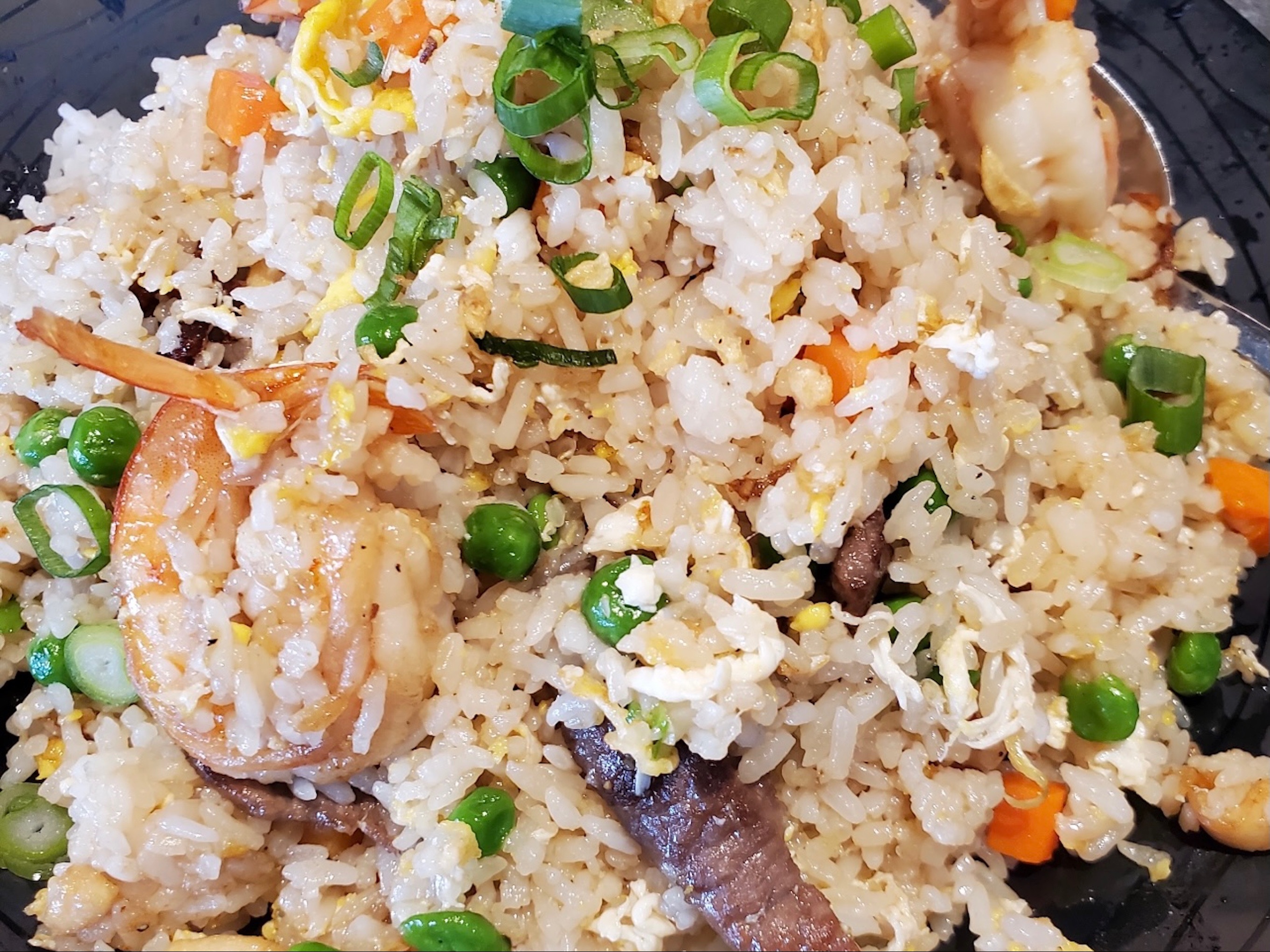 Includes eggs, red onions, carrots, peas and green onions with choice of protein.