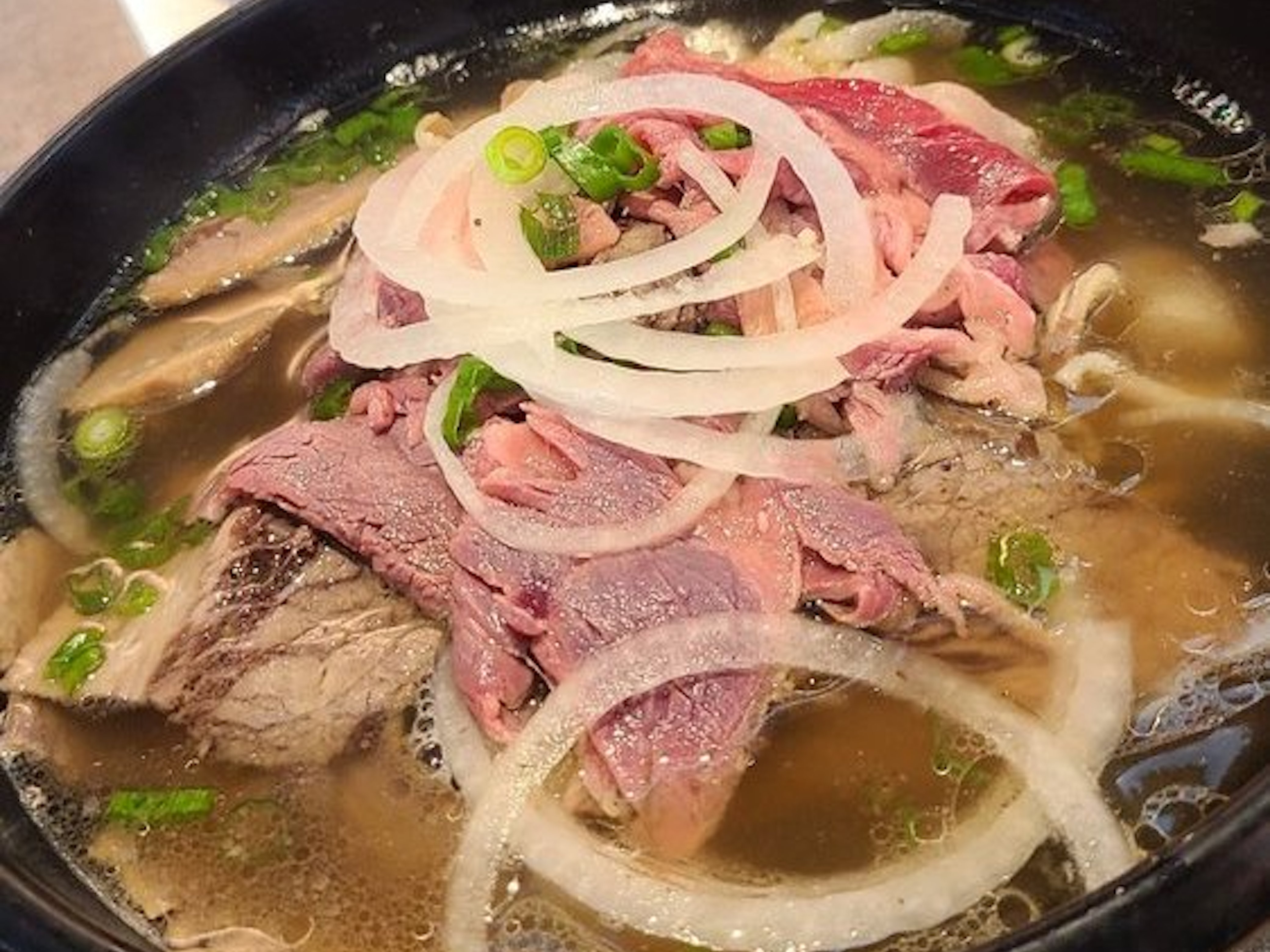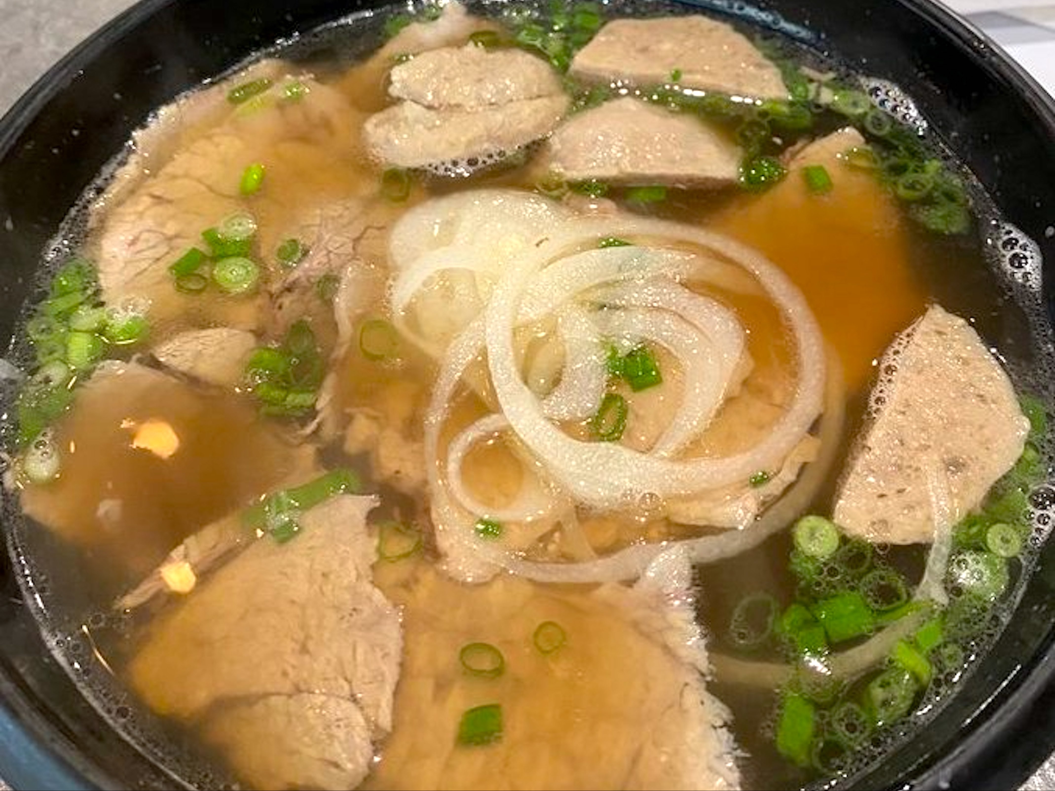 Egg noodles served in homemade beef broth topped with tender beef shank stew, Napa cabbage, hardboiled egg, green onions and fried garlic.
