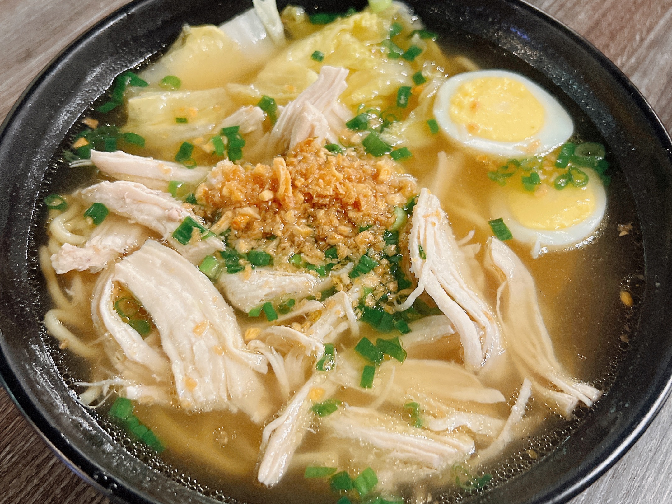 Egg noodles served in homemade beef broth topped with chicken, Napa cabbage, hardboiled egg, green onions and fried garlic.