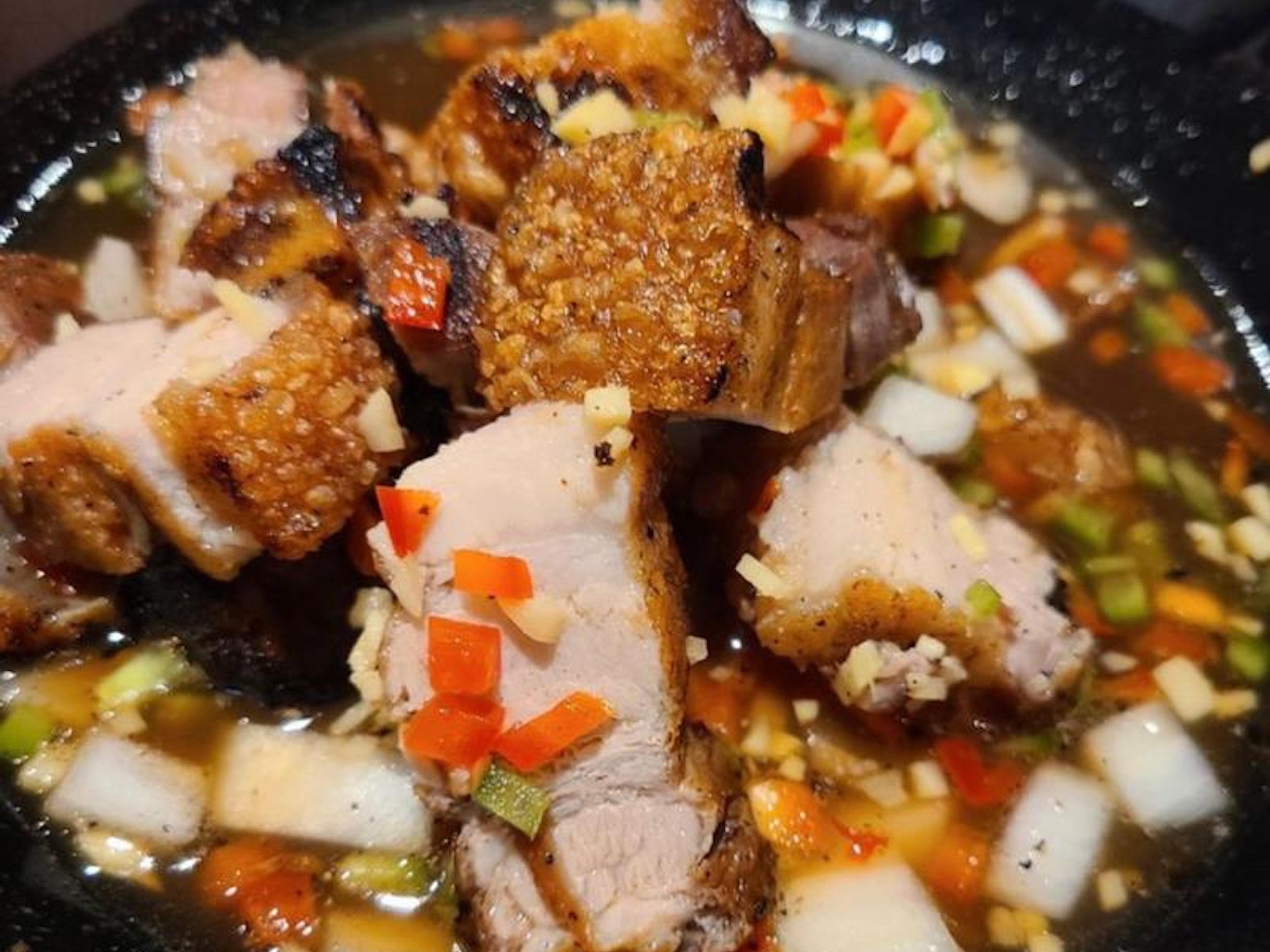 Grilled tender pork belly cubes tossed in vinegar and soy with diced bell pepper, onions and ginger.