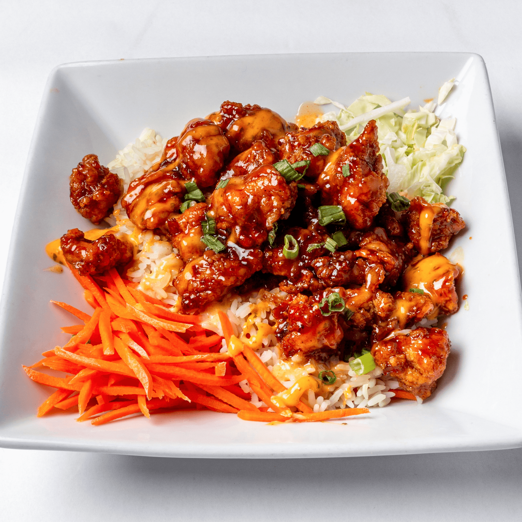 Sriracha glazed chicken, white rice, cabbage, carrots, scallions, unagi sauce, sriracha aioli, yum-yum sauce