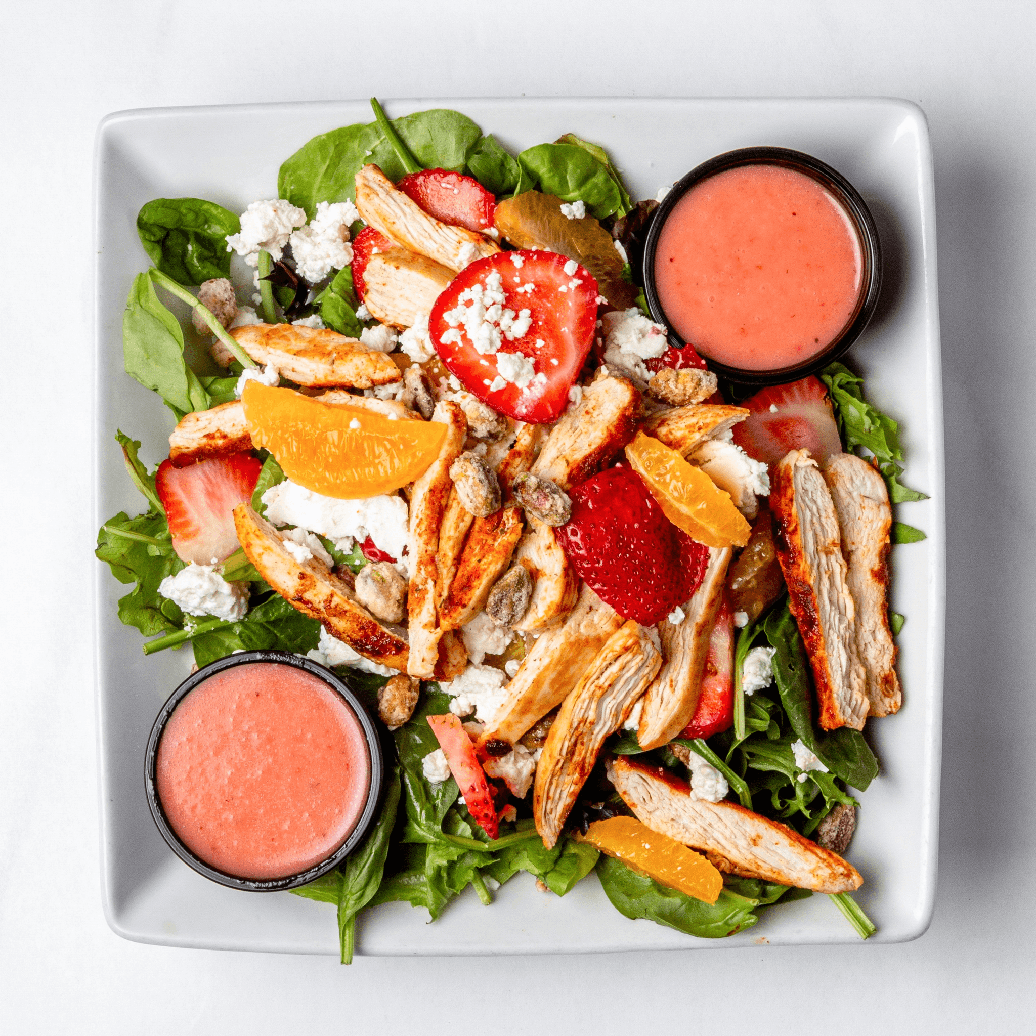 Field greens, blackened chicken, strawberry, oranges, candied pistachio, goat cheese, strawberry vinaigrette