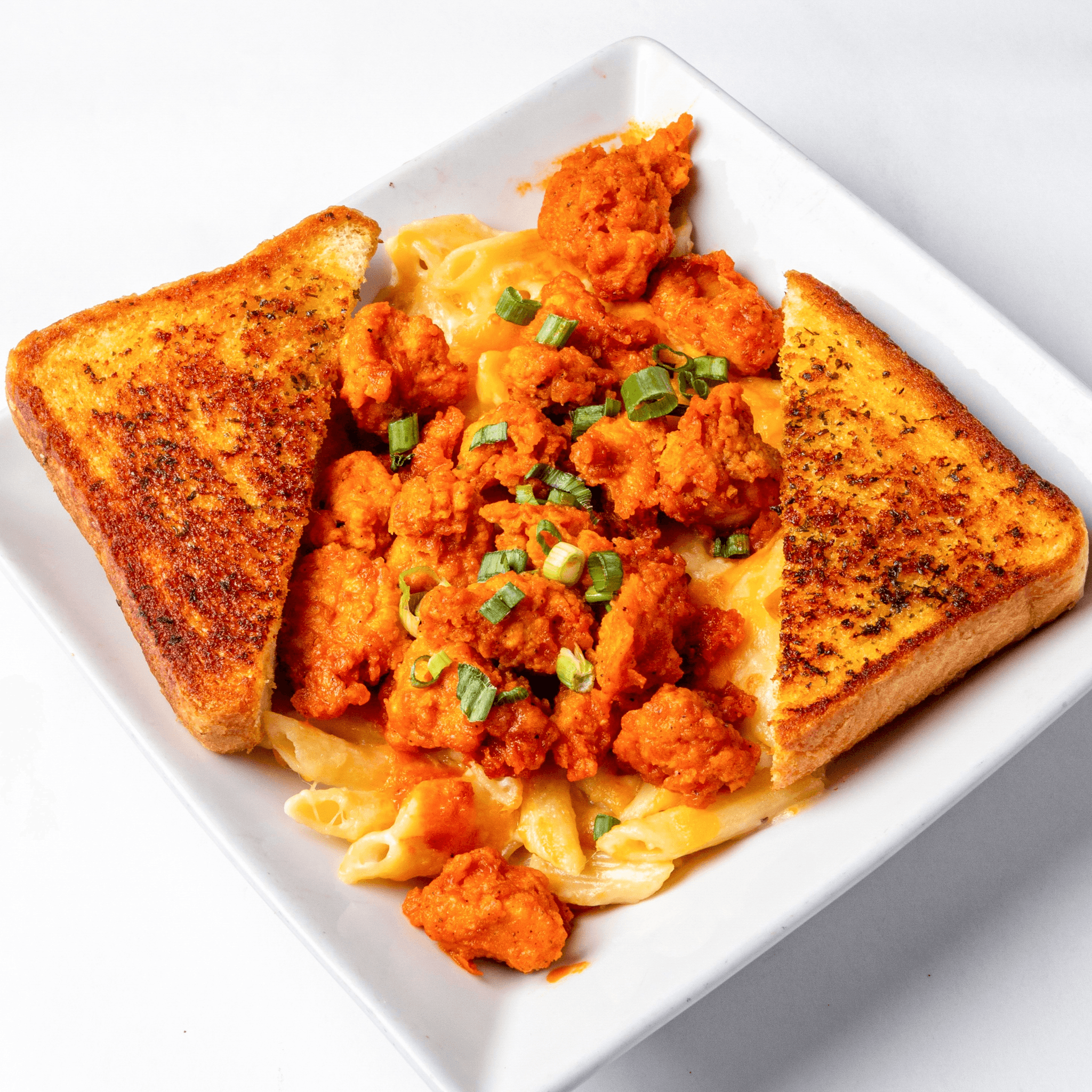 Crispy chicken, buffalo sauce, scallions, garlic bread