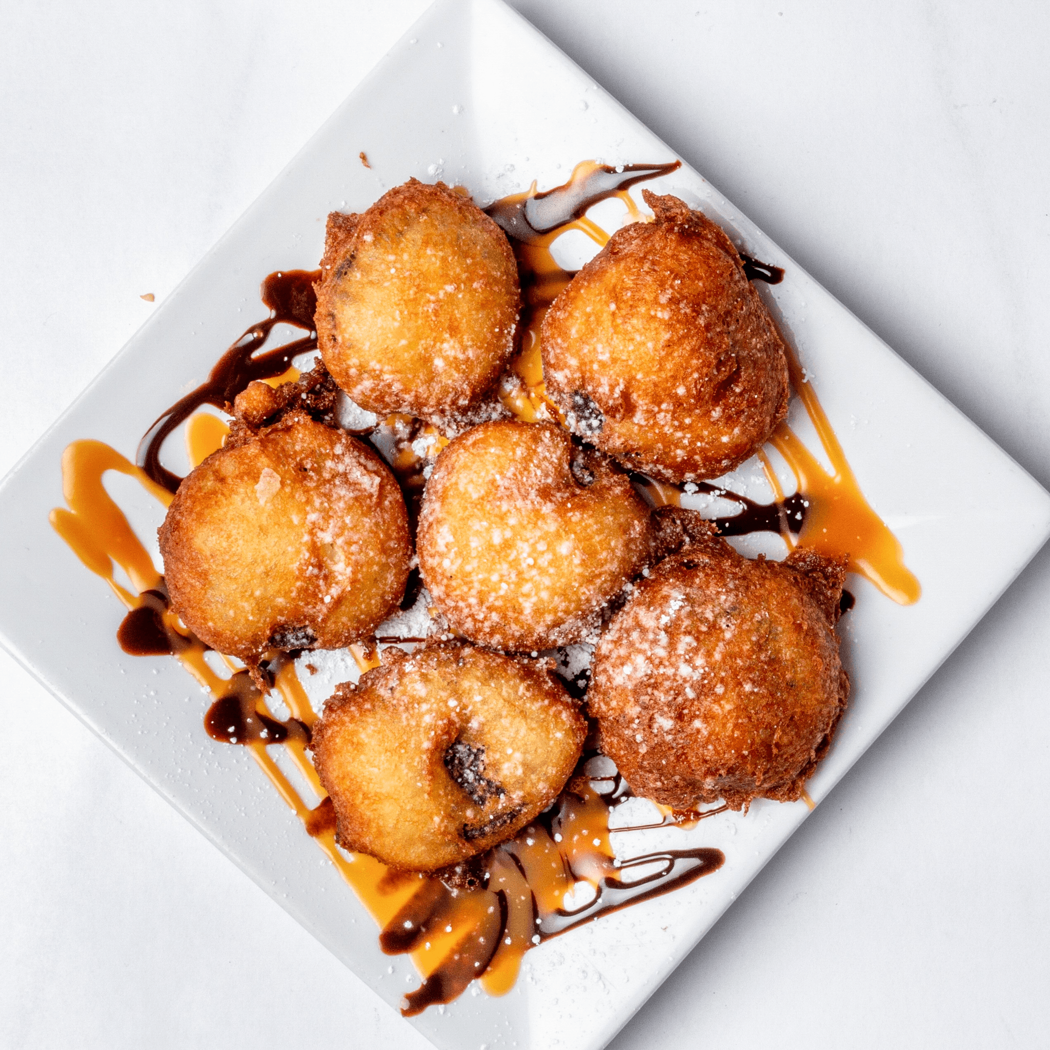 Deep-fried in donut batter, powdered sugar, caramel, chocolate syrup