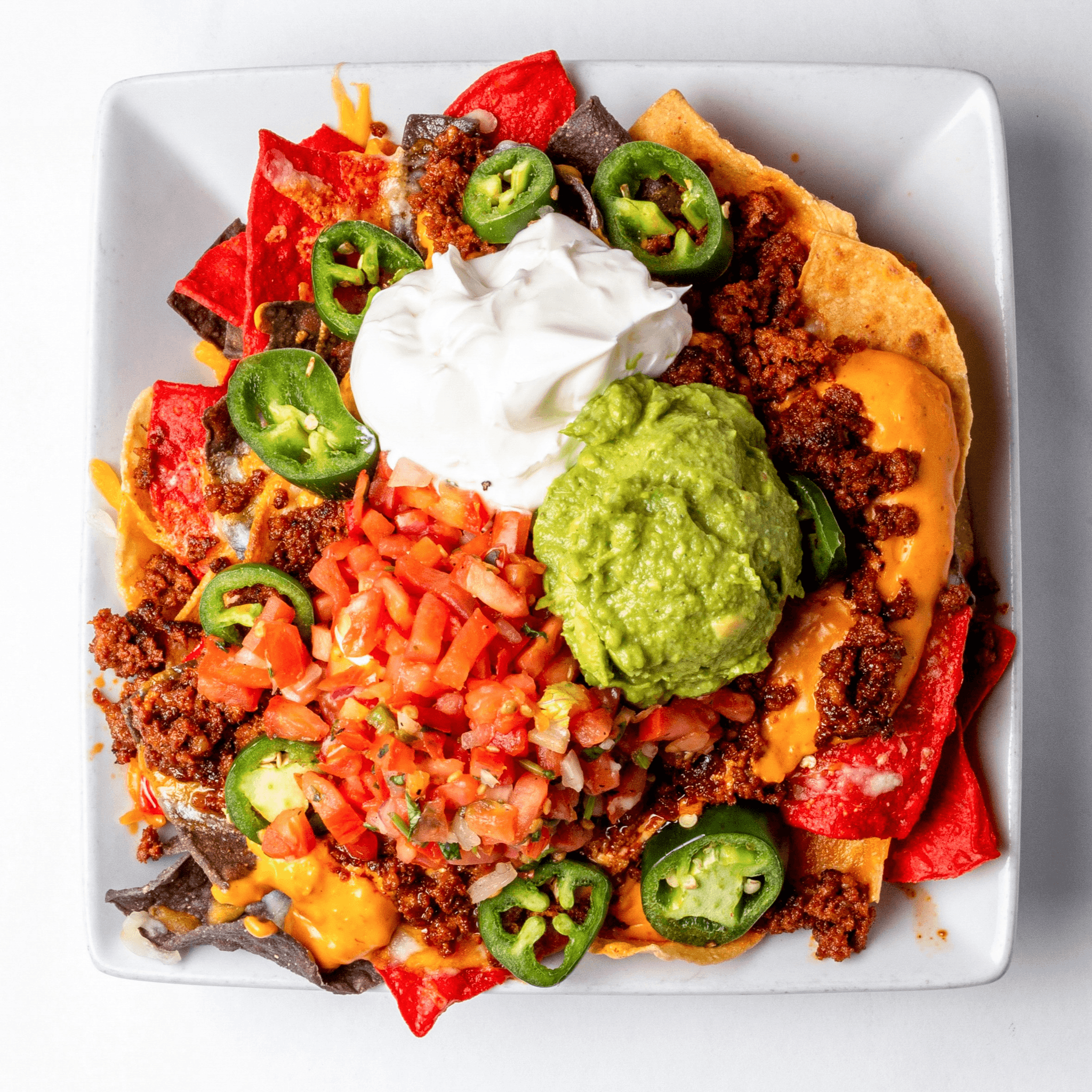Cheddar cheese, avocado, sour cream, pico de gallo, jalapeño, chicken, chorizo or carnitas