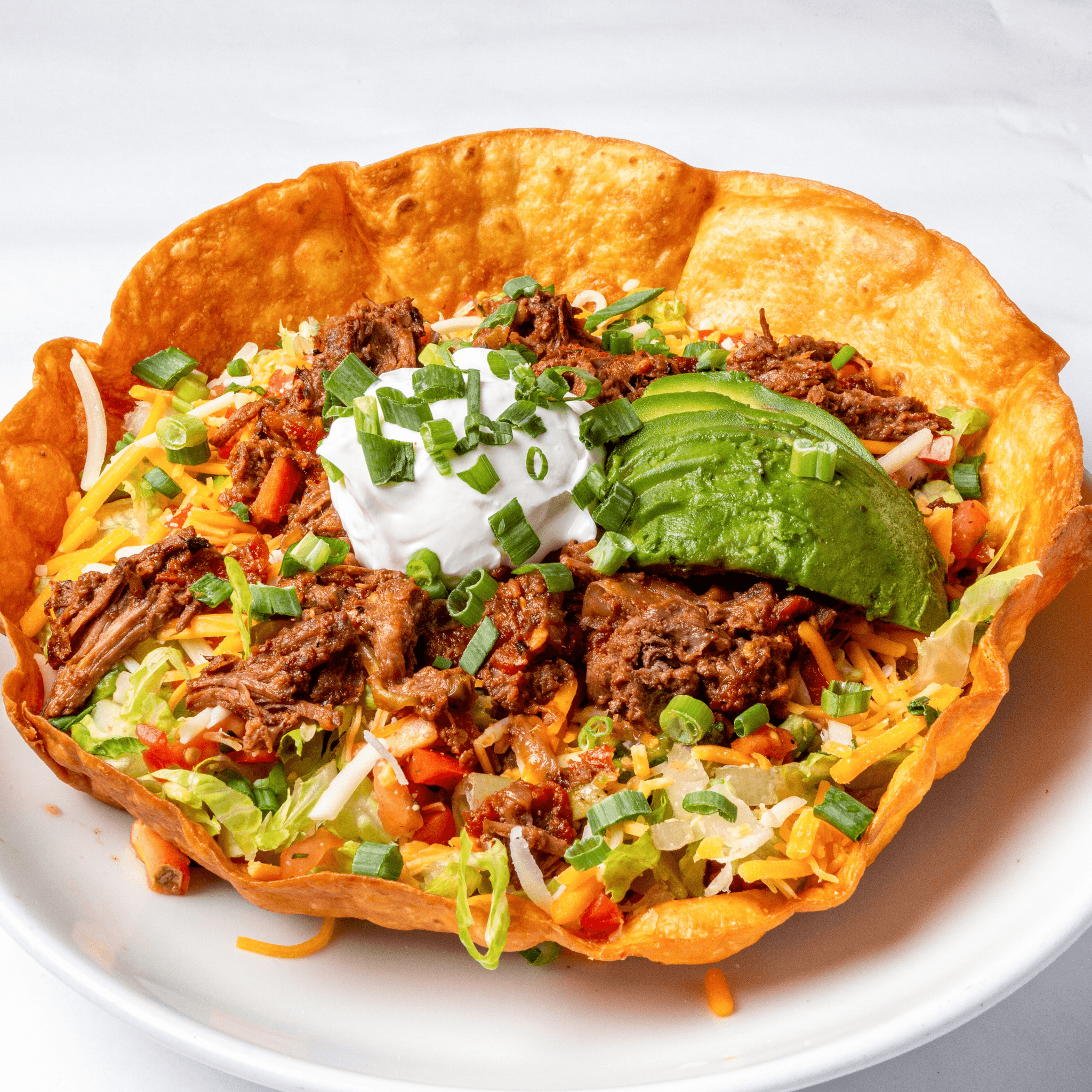 Tortilla shell filled with black beans, Spanish rice, romaine hearts, fiesta cheese, pico de gallo, avocado, topped with sour cream, with your choice of chicken, ground beef, or shrimp