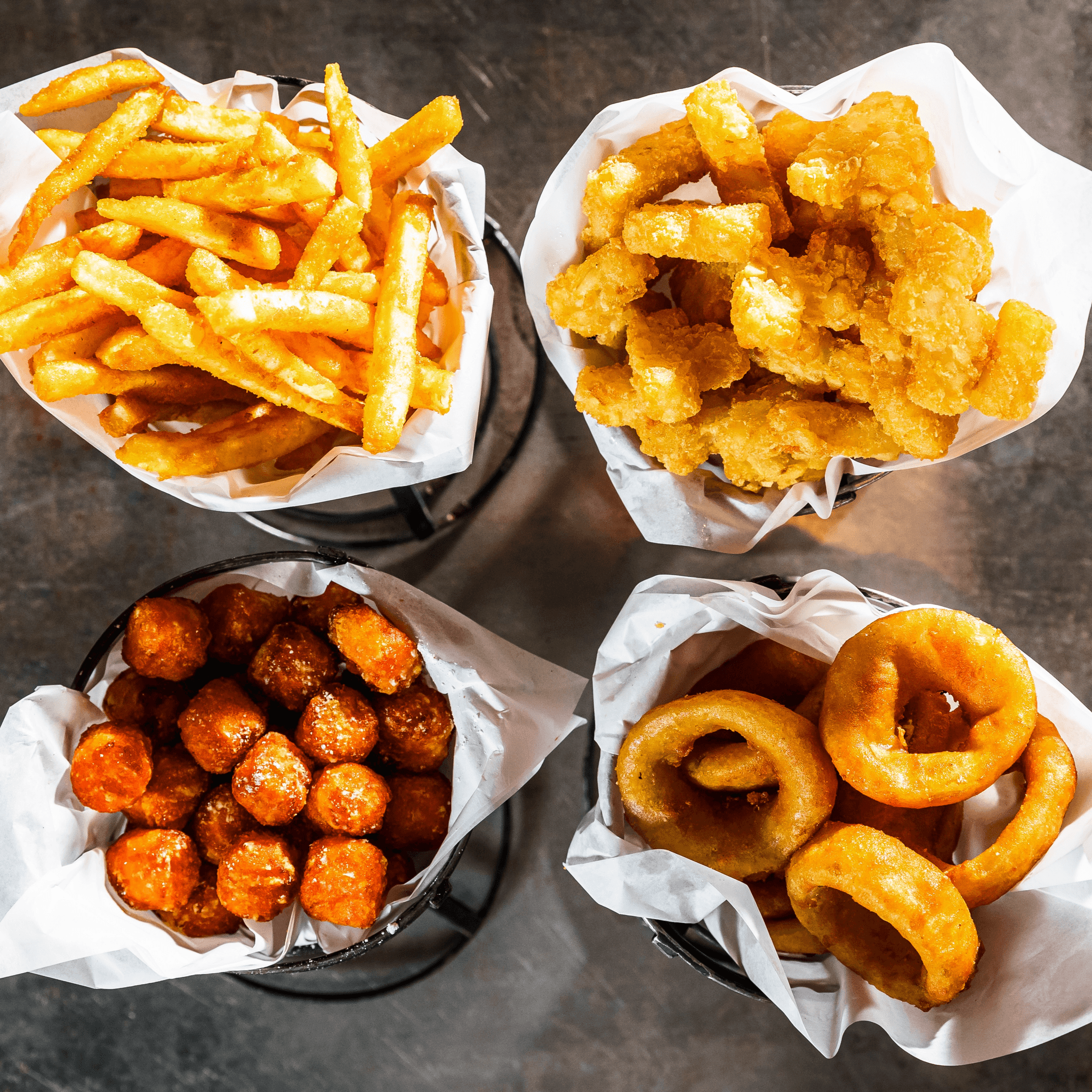Fries, sweet potato fries, onion rings, tater tots, white rice, coleslaw, mac salad, side salad, soup du jour