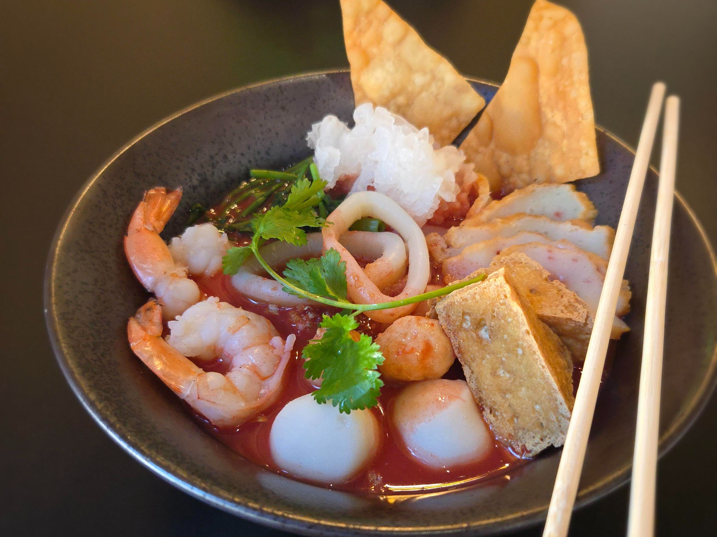 Red sweet and sour broth loaded with flat rice noodle, squid, shrimp, fish ball, fishcake, shrimp ball, white cloud mushroom, water spinach, fried wonton, fried tofu then topped with cilantro and green onion