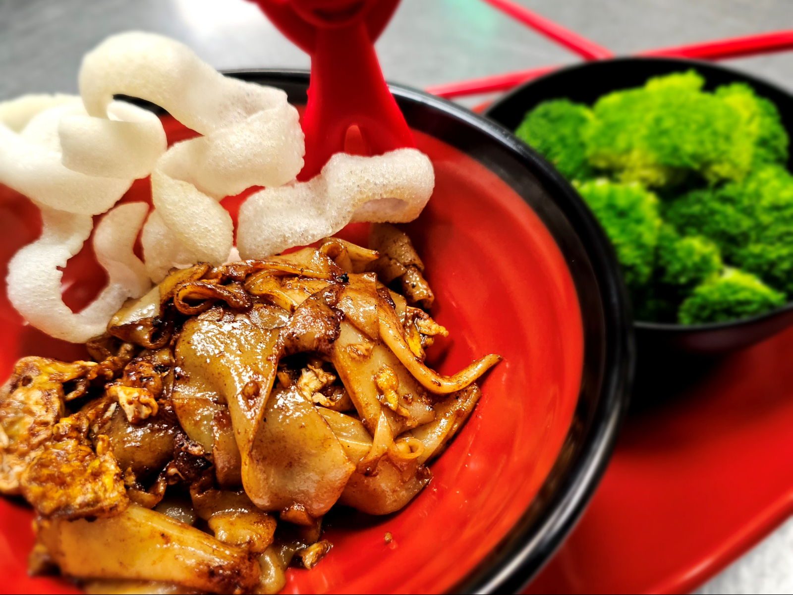 Charred flat rice noodle, dark soy sauce, Chinese broccoli, and special gravy with egg white. Your choice of protein