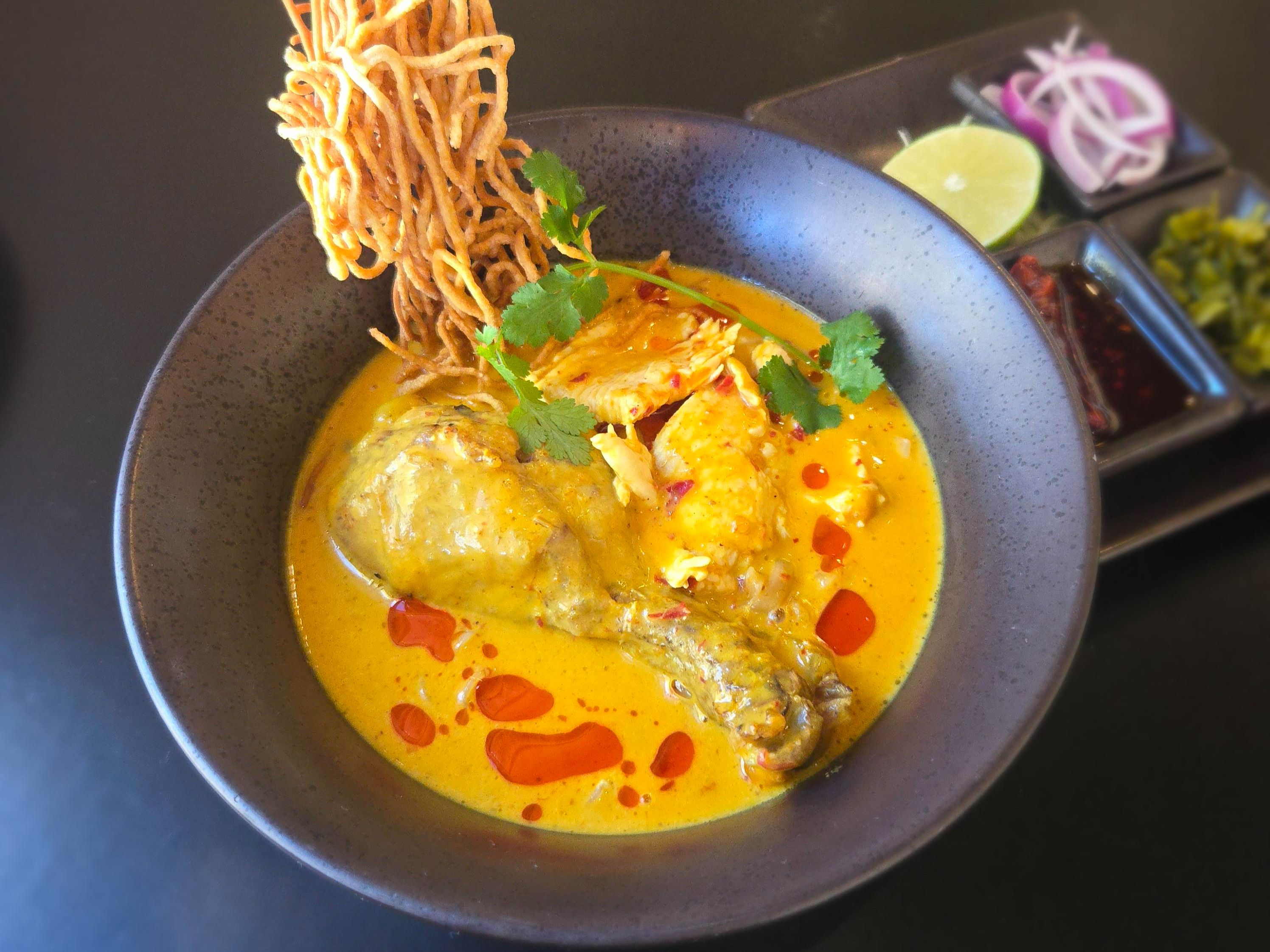 Well known Northern of Thailand egg noodle dish with rich curry broth. Served on the side with pickled mustard green, red onion, crispy fried egg noodle. Your Choice of braised jumbo chicken drumette or braised beef shank with tendon and tripe