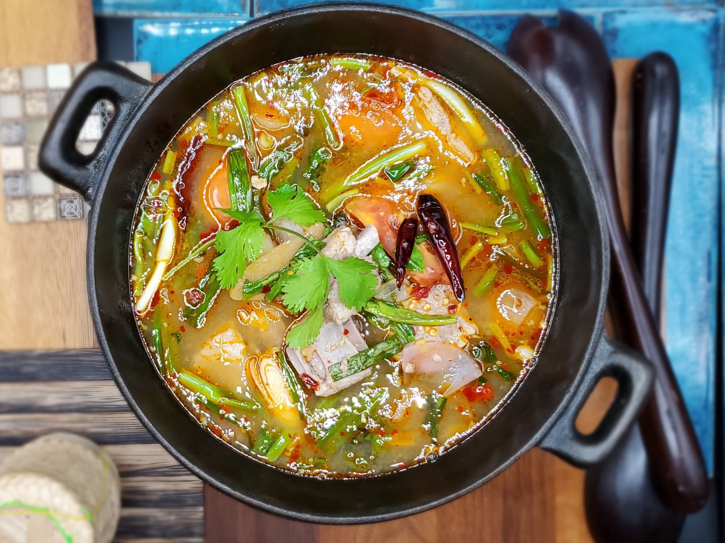 Herb broth with sweet chili paste, galangal, lemongrass, mushroom, tomato, onion, cilantro, kafir lime leaves, and lime juice