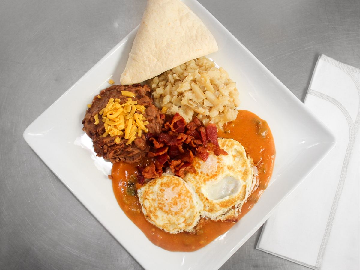 2 over easy eggs, smothered in red or green chili, cheese with rice, beans, flour tortilla on side, your choice of protein