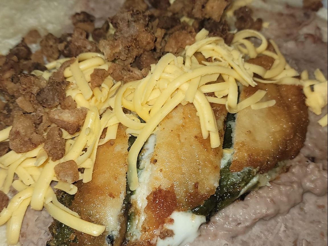 Chili relleno, beans, chili, cheese inside