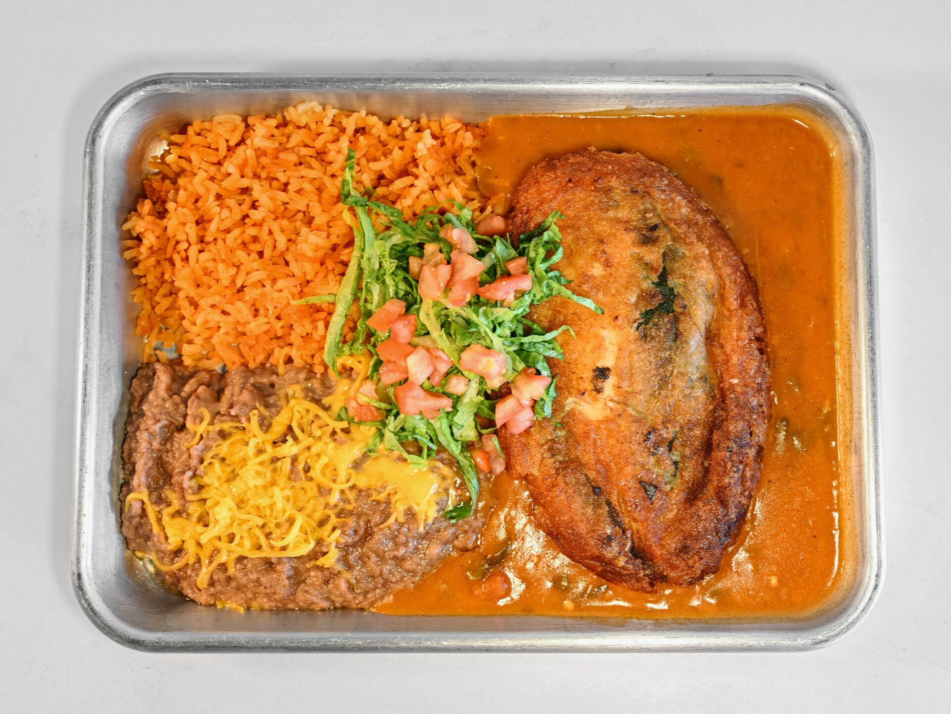 Monterey jack filled relleno, soft or crispy. Comes with rice & beans, lettuce, tomato, flour tortillas
