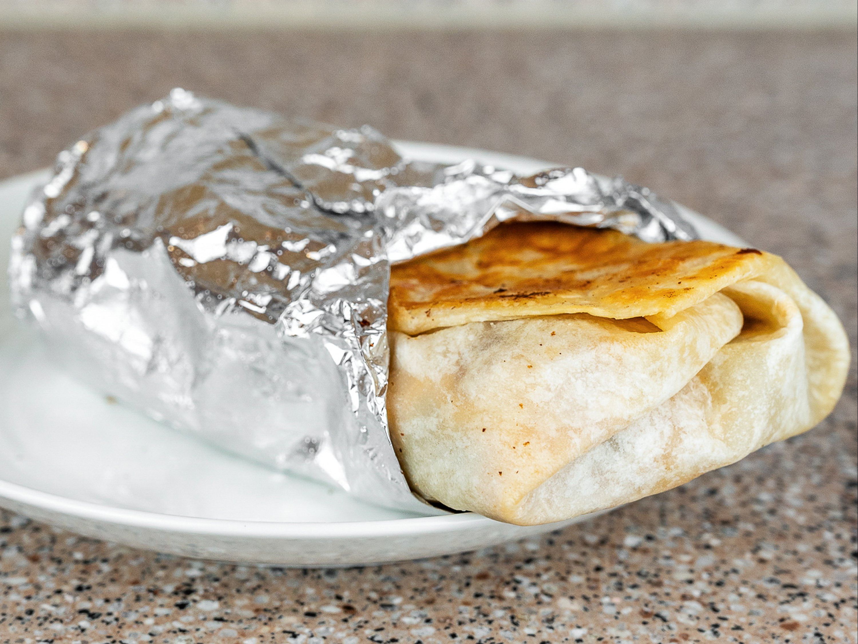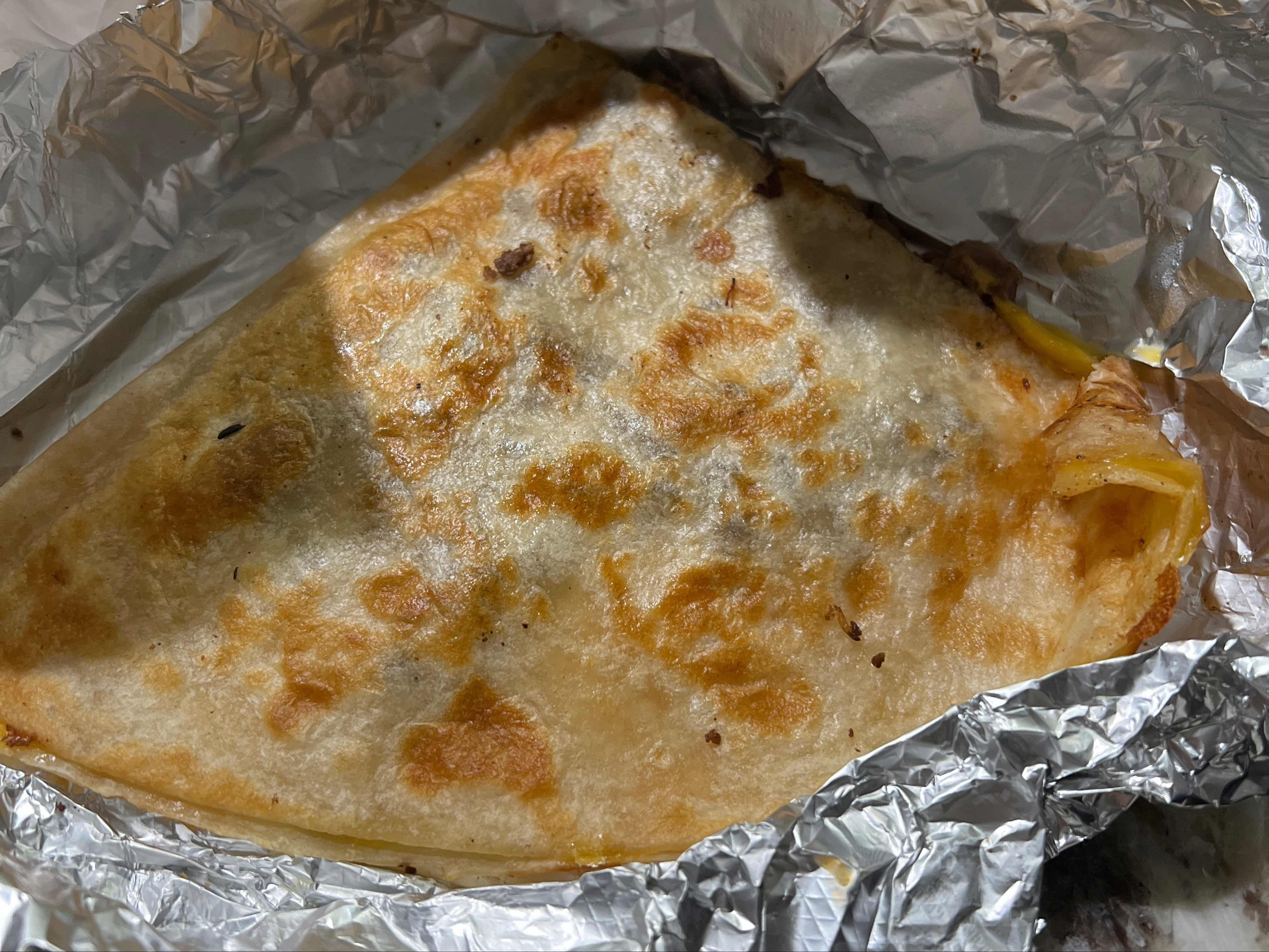Flour tortilla filled with beans, hamburger patty, chili, cheese