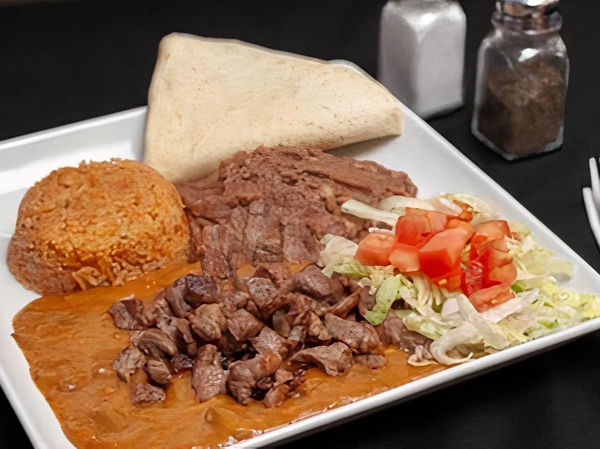 Beans, side of green chili, guacamole, sour cream, your choice of protein. Comes with rice & beans, lettuce, tomato, flour tortillas
