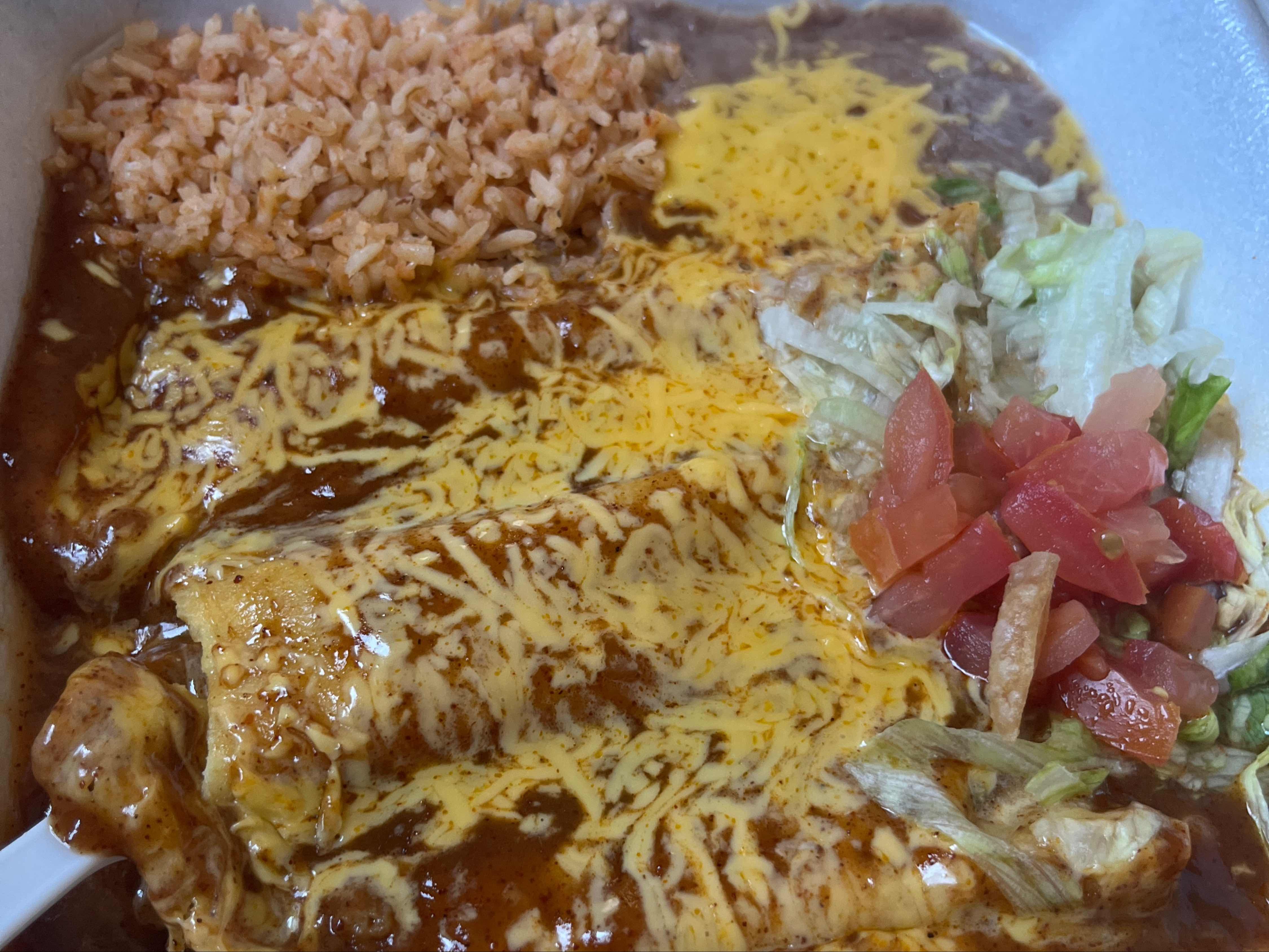 Red or green chili, 3 cheese enchiladas, choice of protein