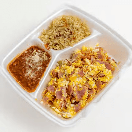 Beans, potato, cheese, and your choice of breakfast meat ham, chorizo or bacon with 3 eggs and wrapped in flour tortilla.