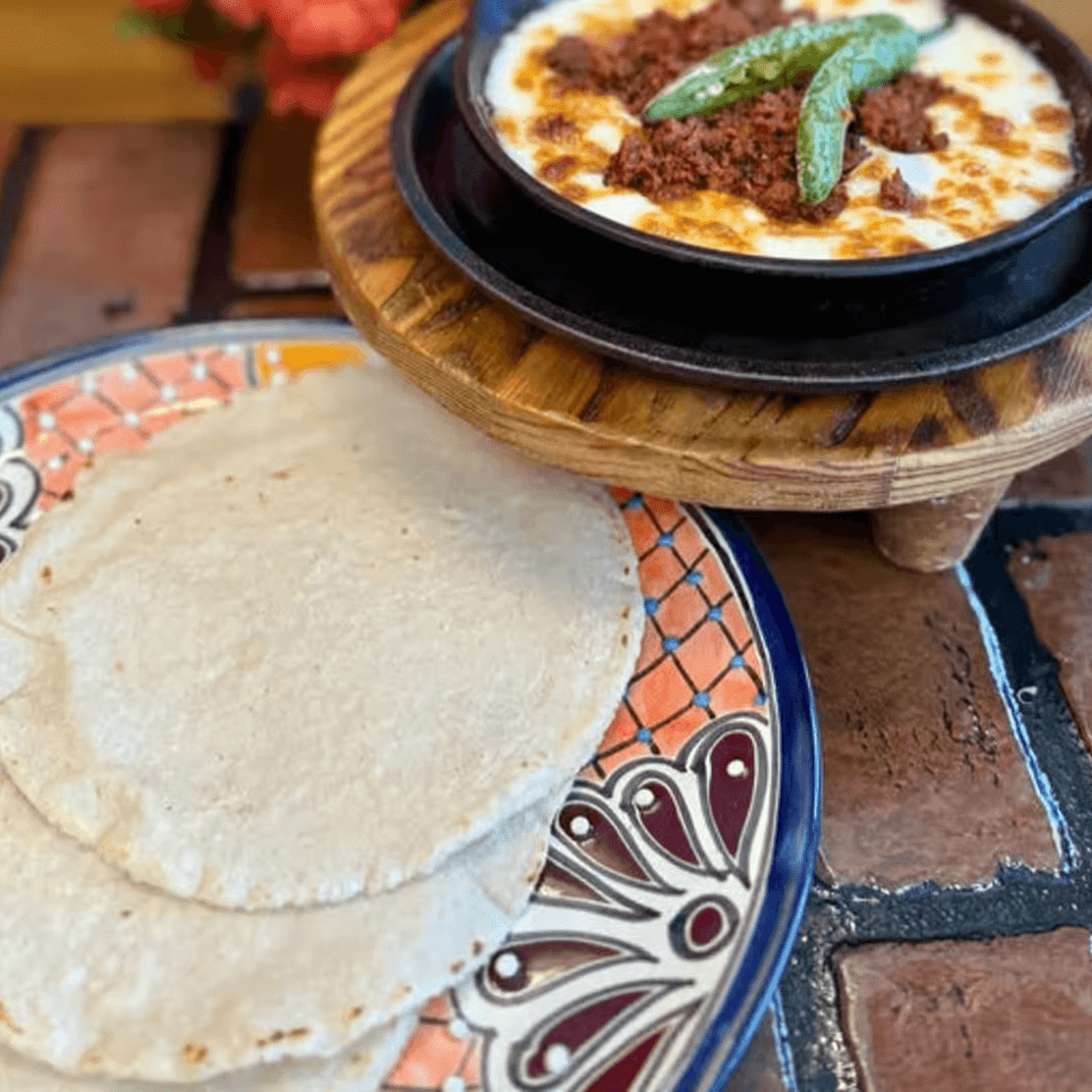 Melted cheese with chorizo sausage and serrano chile.