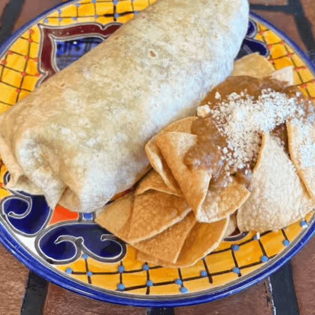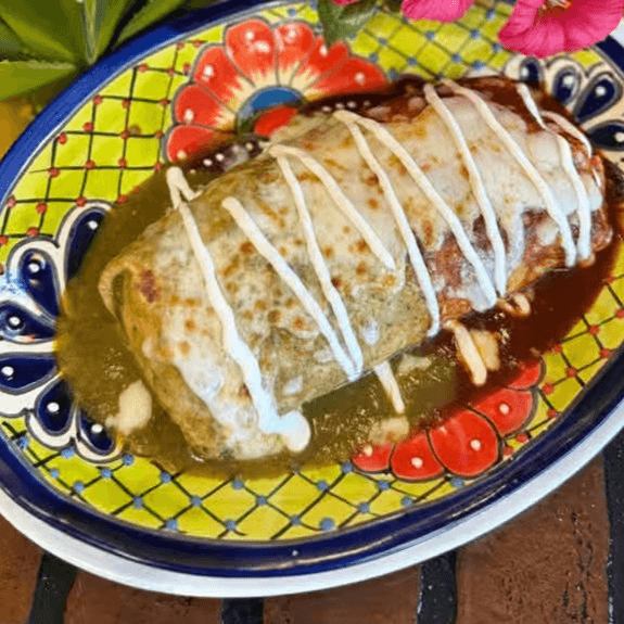 Enchilada style, red or green with your choice of meat, asada, chicken, carnitas or pastor.