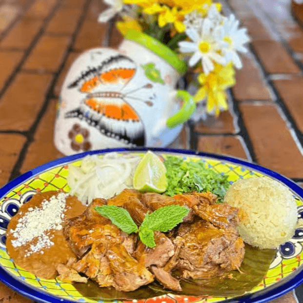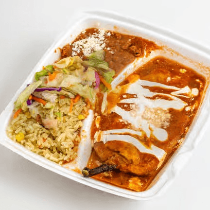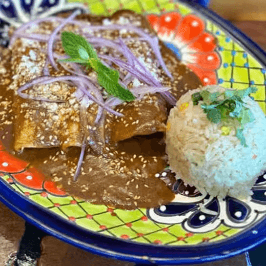 3 enchiladas in our special mole recipe, filled with chicken and served with rice.