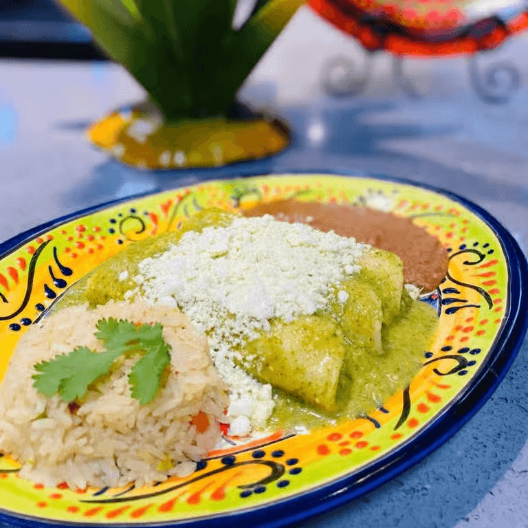 3 enchiladas, cheese or chicken, and your choice of green or red sauce.