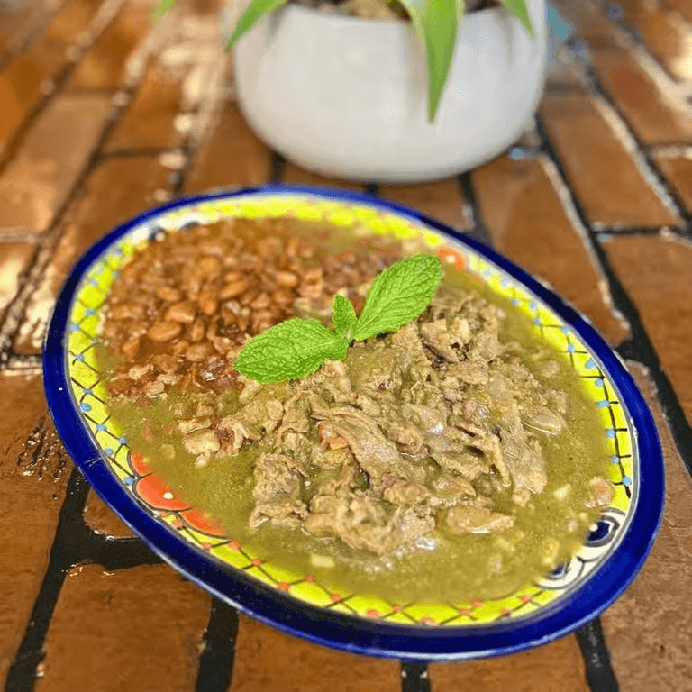 Chopped beef, seasoning and slow cooked with tomatillo, onions, bacon and served with whole pinto beans.