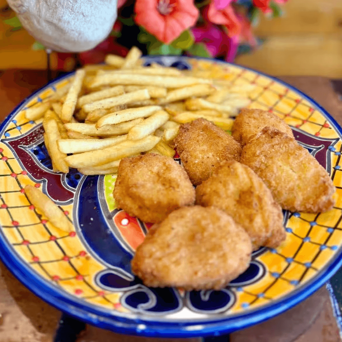 Deep fried served with fries and salad.