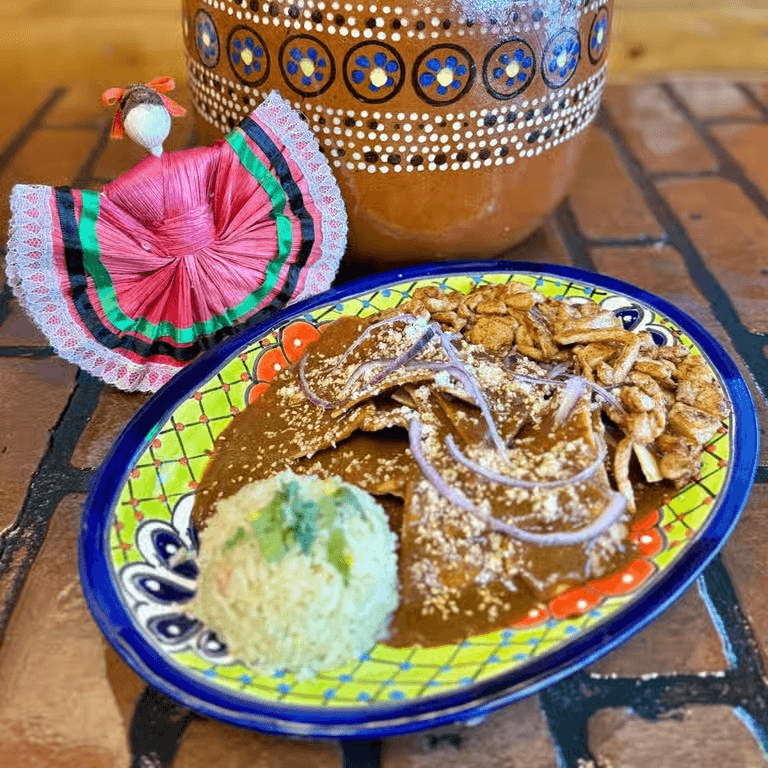 Crispy tortilla chips simmered in our rich flavorful mole sauce and topped with chicken.