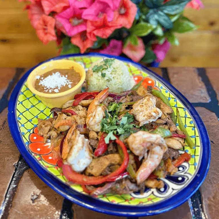 Carne asada, grilled chicken, carnitas, pastor, and hot sausage links and a choriqueso, served with rice, beans, and tortillas.