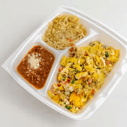 Scrambled eggs with onions, tomato, and serrano peppers.