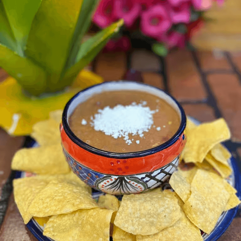 Refried pinto beans with chorizo sausage.