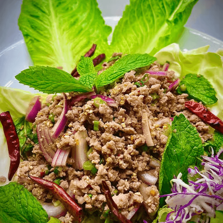 Minced chicken or pork with lime, chili, shallots, mint, and toasted rice for a vibrant dish.